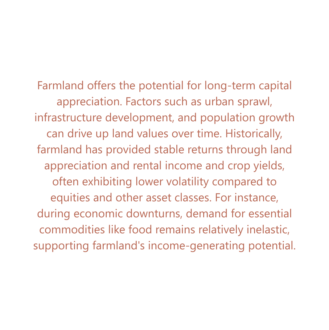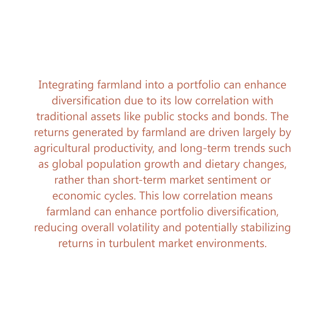 Farmland is among the oldest and most timeless asset classes, deeply connected to humanity’s fundamental and growing need for food. It represents a unique and increasingly popular alternative asset class, characterized by its use for agricultural functions such as crop cultivation and raising livestock. With global populations rising and productive agricultural land gradually becoming scarcer, farmland represents an opportunity to invest in a finite (and generally shrinking) and essential resource. Farmland can provide investors with the potential for stable, long-term capital appreciation driven by increasing land values, enhanced agricultural productivity, and demographic pressures. Historically, farmland has demonstrated resilience, acting as an effective hedge against inflation and economic volatility. Additionally, due to its low correlation with traditional assets such as public equities and bonds, farmland can offer significant diversification benefits, helping investors foster long-term growth and stability within diversified portfolios.