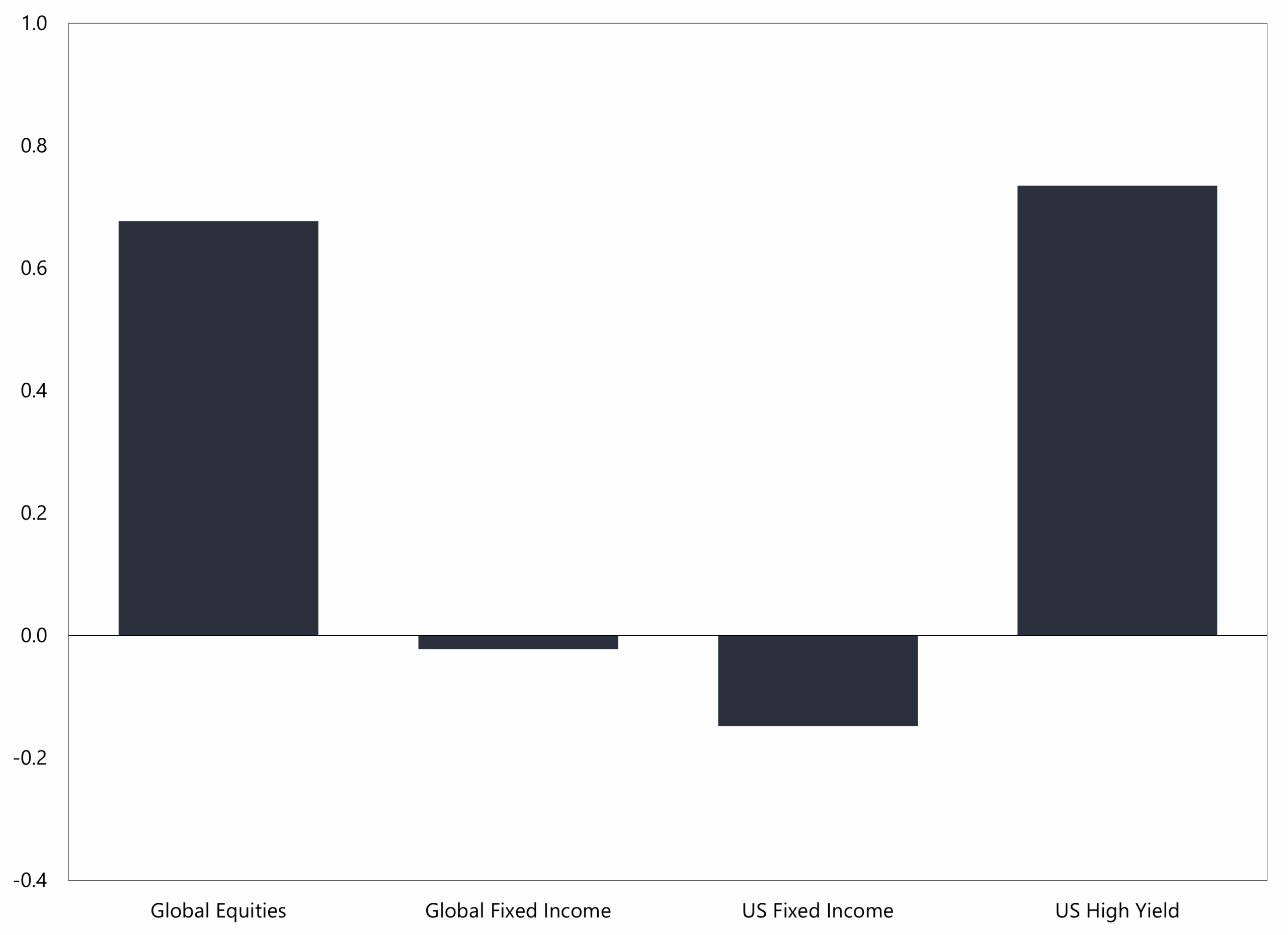 Data as of June 30, 2025. Source: Cliffwater, Bloomberg, Westcourt analysis. Note: Global Equities is represented by MSCI World Net Total Return Index; Global Fixed Income by Bloomberg Global Aggregate Total Return Index; US Fixed Income by Bloomberg US Aggregate Total Return Index; US High Yield by Bloomberg US Corporate High Yield Total Return Index. For illustrative purposes only. Past results do not guarantee future performance.