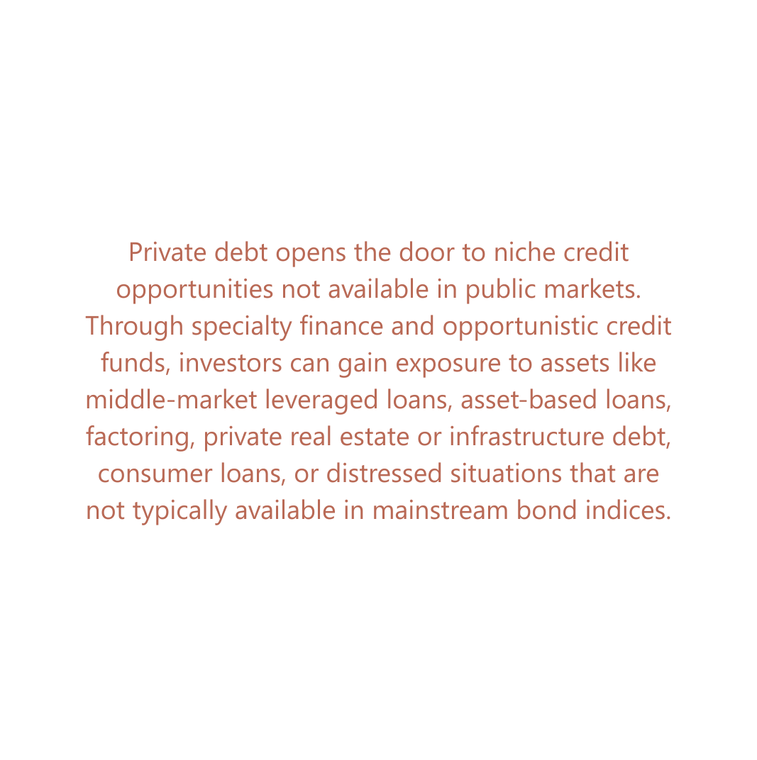 Private debt (often called private credit) refers to loans and debt financing provided through private channels rather than public markets. In practice, non-bank lenders (like private funds, insurance companies, or asset managers) extend credit directly to borrowers, and these debt instruments are not issued or traded on public exchanges.