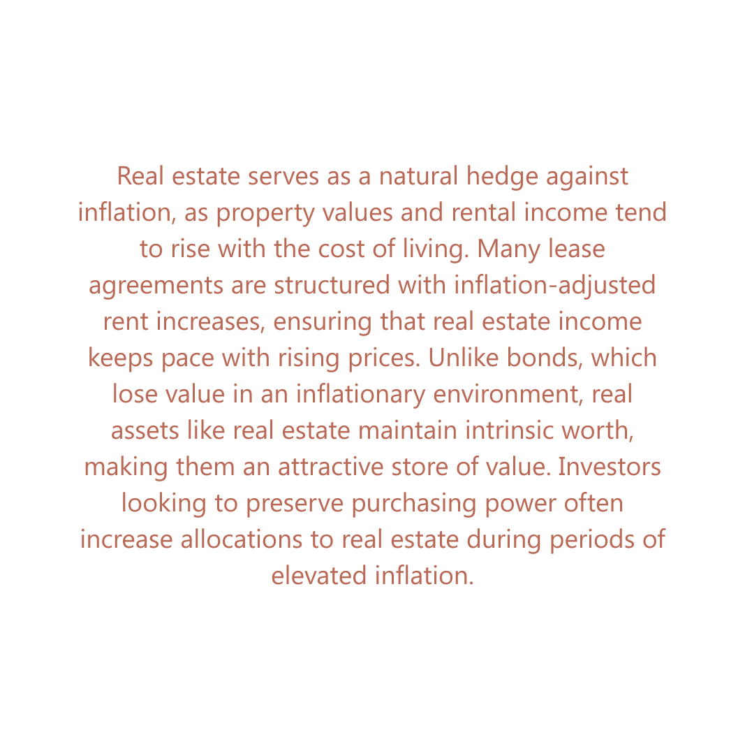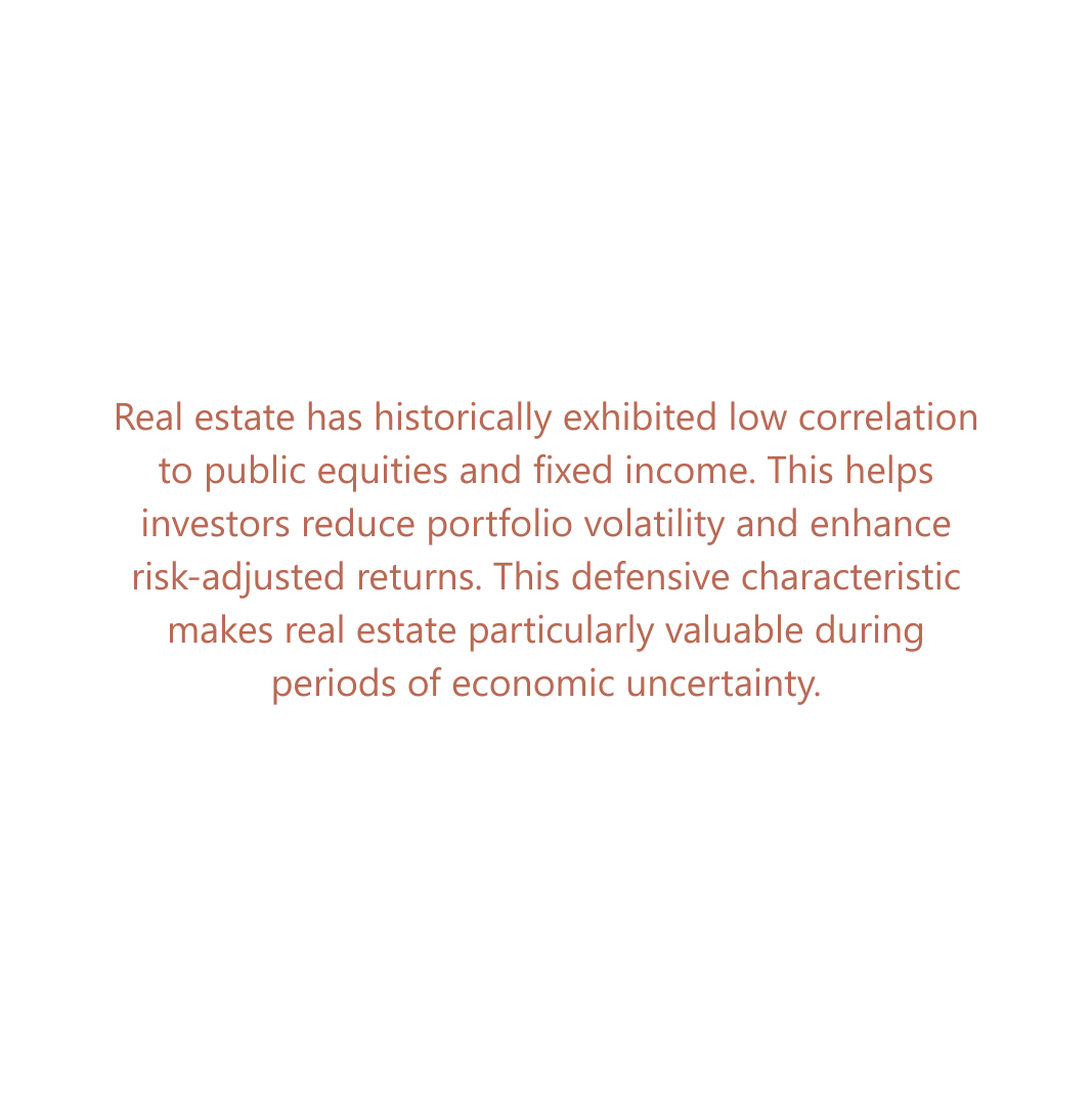 Real estate refers to direct ownership or private investment in income-generating properties, rather than publicly traded real estate securities. Investors gain exposure to physical assets – such as multifamily apartments, office buildings, industrial warehouses, and retail centres – generally through private investment vehicles. Real estate offers stable tax-efficient rental income, potential capital appreciation, and inflation protection, often with low correlation to stock and bond markets, enhancing portfolio diversification. Strategies range from core (low risk, stabilized assets) to opportunistic (higher risk, value creation projects). While less liquid than publicly traded real estate, real estate investments can deliver attractive, risk-adjusted returns over long holding periods through professional asset management.